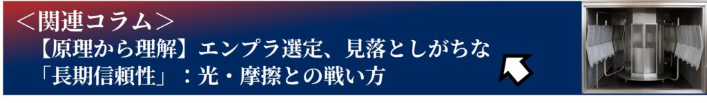【原理から理解】のコラムシリーズでは、プラスチックの性能差が分子レベルの原理に根差していることを探求してきました。「汎用プラスチック、エンプラの違い(前編)」では耐熱性や機械的特性、「汎用プラスチック、エンプラの違い(後編)」では難燃性や耐薬品性、「エンプラ選定、見落としがちな長期信頼性」では耐候性や摺動性といった特性について、汎用プラスチックとエンプラの違いを生み出す「分子の秘密」を解説しました。