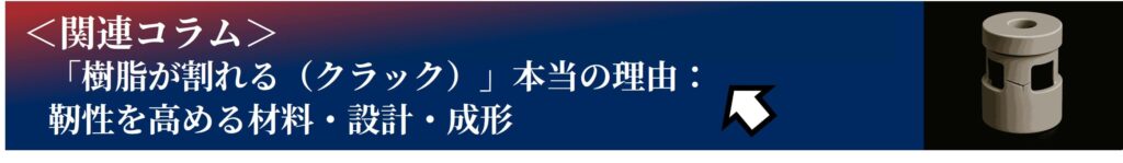 ここまで、前編として、プラスチック部品が「割れる」メカニズムの基本(クラック発生→進展→破断)、破壊様式の違い(脆性破壊 vs 延性破壊)、そして割れを引き起こす主な要因(低温、応力集中形状、衝撃荷重)について解説しました。エンプラといえども、これらの要因が複合的に作用することで、予期せず脆性的な破壊を起こす可能性があることをご理解いただけたかと思います。では、こうした破壊を防ぎ、より「割れにくい」=「靭性の高い」製品を作るためには、具体的にどのような工夫ができるのでしょうか?