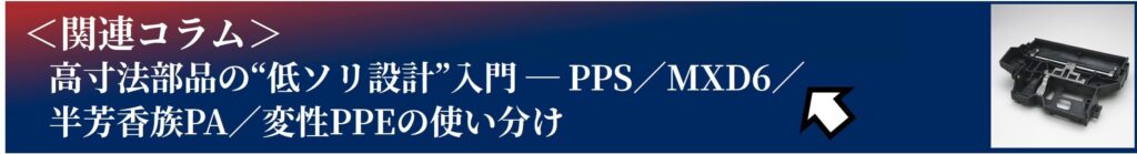 高寸法部品のソリ対策ガイド ─ PPS/MXD6/半芳香族PA/変性PPEを活かした設計・金型・成形条件の最適化