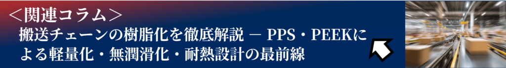 高温環境下での搬送ラインでは、耐熱性と機械的強度が不可欠です。