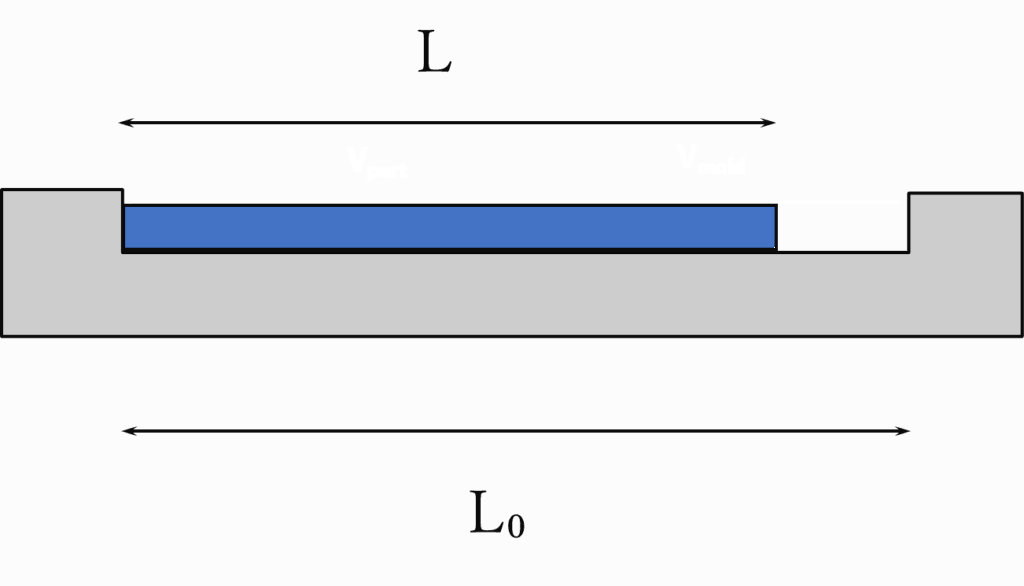 成形収縮率は、キャビティ寸法(L₀)と成形品寸法(L)の差を比率で示すものです(α=(L₀−L)/L₀)。これは金型設計に不可欠な指標です。