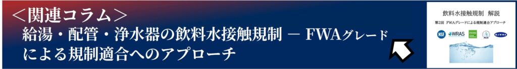 国際的な飲料水接触規制への適合は複雑であり、設計者にとって大きな負担となりがちです。そこで注目されるのが、あらかじめ飲料水・食品接触用途に特化して開発された「FWAグレード」と呼ばれる材料群です。