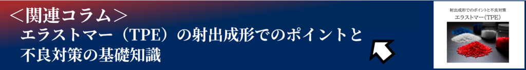 TPEEは他のエラストマーに比べて成形収縮率が大きく、特に流動方向と直角方向で収縮率が異なります。TPS用に設計された金型でTPEEを成形すると、寸法が小さくなりすぎて嵌合できない、あるいは大きく反ってしまうというトラブルが頻発します。TPEEを採用する場合は、専用の金型設計が必要です。