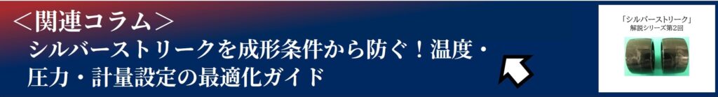 シルバー(銀条)は、樹脂表面に発生する筋状の模様であり、一般には樹脂中の水分や揮発ガスが気泡となり、それが引き伸ばされて生じると説明されます。しかし、ベント不良の視点からは「フローフロント(流動先端)の乱れ」として捉えることが本質的です。