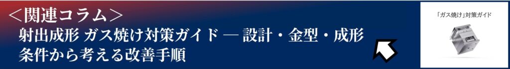 シルバー、ガス焼け、ショートショット。これらは一般に「別々の不良」として理解され、それぞれ個別の対策が講じられがちです。しかし、実務の現場では、これら3つの不良が同時に、あるいは連続して発生する事例が非常に多く見られます。その背景にあるのが「ベント不良=ガス排出性能の不足」です。これまでのコラムでは不良現象ごとに解説をしてきましたが、今回はこれらを「共通原因としてのベント不良」という視点から横断的に体系化します。