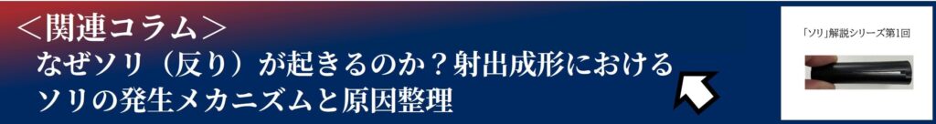 特にガラス繊維(GF)などの強化材を含む場合、繊維が流動方向に配向してつっかい棒となるため、流動方向の収縮は抑えられますが、直交方向(TD)は樹脂の収縮がそのまま現れます。この収縮差(異方性)が、成形品の反りやねじれの正体です。ソリは単なる変形ではなく、内部の「配向状態の可視化」であると言えます。