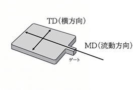 配向した分子鎖は、冷却固化する際に元のランダムな形状に戻ろうとするため、流動方向(MD)に強く収縮しようとします。
